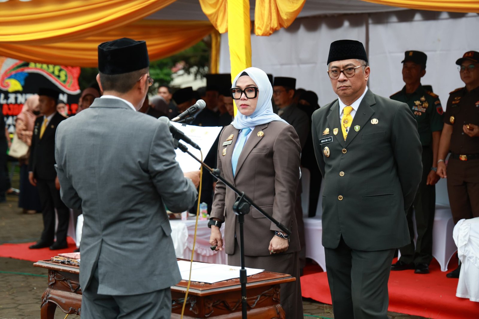 Turut hadir, Ketua PMI Kab.Barru, Ketua dan anggota DPRD Kab.Barru, unsur Forkopimda, Panitera Muda Perdata Pengadilan Negeri Barru, Pj.Sekda Barru, Ketua TP PKK Kab.Barru, para staf ahli Bupati dan Asisten Setda Barru, para pimpinan OPD, para Kabag Setda Barru, Direktur RSUD La Patarai Barru, para Camat, pimpinan Perbankan, para Lurah dan Kepala Desa, Tokoh Masyarakat, serta para pejabat yang dilantik beserta keluarga.arru – Bupati Barru, Andi Ina Kartika Sari,S.H.,M.Si. melantik dan mengambil sumpah jabatan Pejabat Pimpinan Tinggi Pratama, Administrator, Pengawas, dan Fungsional di lingkungan Pemerintah Kabupaten Barru yang dipusatkan di Alun-Alun Colliq Pujie, Sabtu sore (14/2/2026).