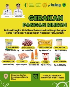 Satukatanews.com. – BARRU – Dinas Pangan, Tanaman Pangan, Hortikultura dan Perkebunan Kabupaten Barru melaksanakan kegiatan Gerakan Pangan Murah (GPM) sebagai langkah strategis dalam menjaga stabilitas pasokan dan harga bahan pangan menjelang Hari Besar Keagamaan Nasional (HBKN) di halaman Kantor Kecamatan Tanete Rilau, Senin pagi 2/3/2026.
