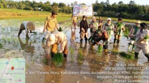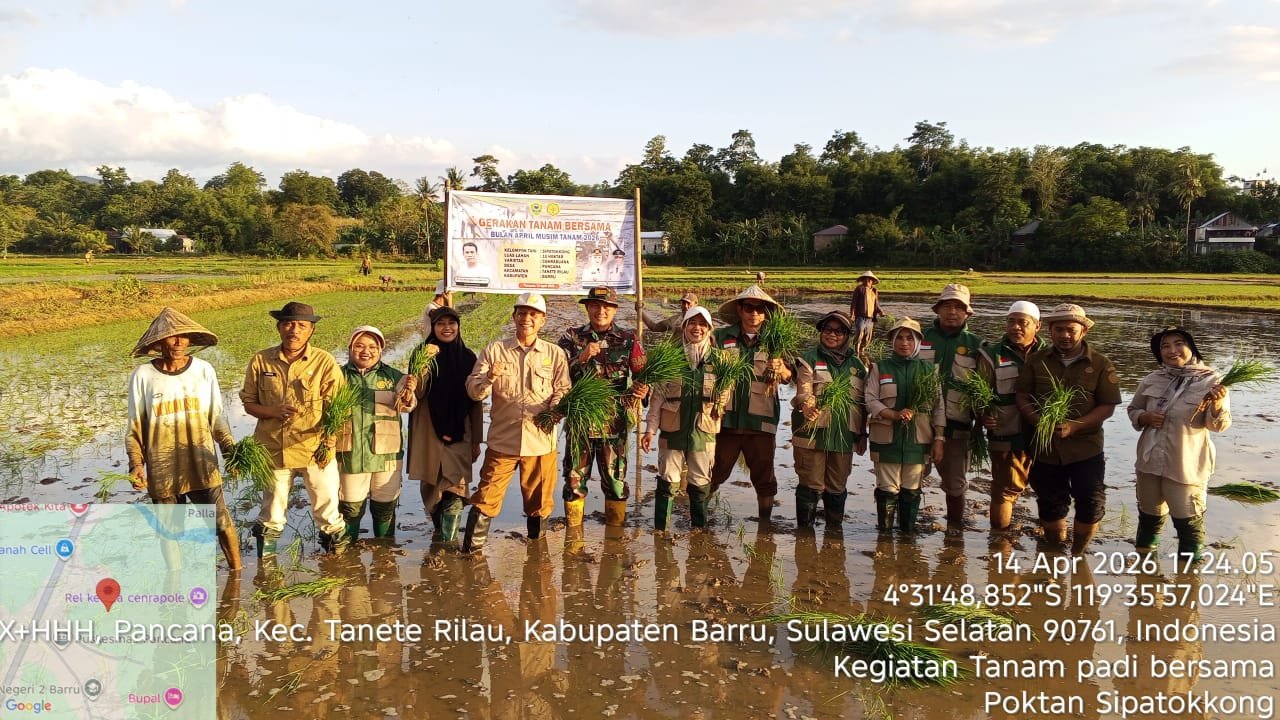 Satukatanews.com. – BARRU – Dinas Pangan, Tanaman Pangan, Hortikultura, dan Perkebunan (TPHBUN) Kabupaten Barru menggelar kegiatan Gerakan Tanam Bersama dalam rangka Musim Tanam April 2026. Kegiatan ini dilaksanakan bersama Kelompok Tani Sipatokkkong yang berlokasi di Desa Pancana, Kecamatan Tanete Rilau, Kabupaten Barru, Selasa 14/4/2026.