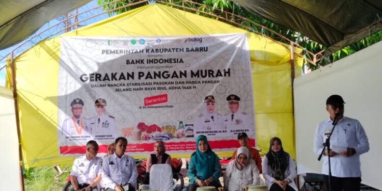 Satukatanews.com. – 4 Juni 2025, – Pemerintah Kabupaten Barru melalui Dinas Pertanian dan Ketahanan Pangan turut ambil bagian dalam pelaksanaan Gerakan Pangan Murah (GPM) Nasional Serentak yang digelar secara serentak di seluruh Indonesia. Di Barru, kegiatan ini dipusatkan di Kecamatan Balusu dan dibuka secara resmi oleh Wakil Bupati Barru, Dr. Ir. Abustan Andi Bintang, M.Si., mewakili Bupati Barru didampingi Ketua TP PKK Andi Milawaty.