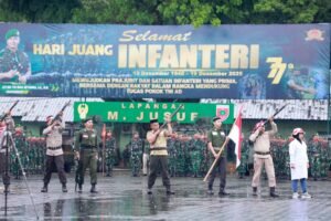 Satukatanews.com. – BARRU – Bupati Barru Andi Ina Kartika Sari, SH., M.Si., menghadiri kegiatan hari juang Infanteri ke 77 tahun Jumat 19 Desember 2025 di lapangan M.Jusuf Kodam XIV Hasanuddin dengan tema mewujudkan prajurit dan satuan Infanteri yang Prima bersama dengan rakyat dalam rangka melindungi tugas pokok Tentara Nasional Indonesia (TNI) Angkatan Darat (AD).