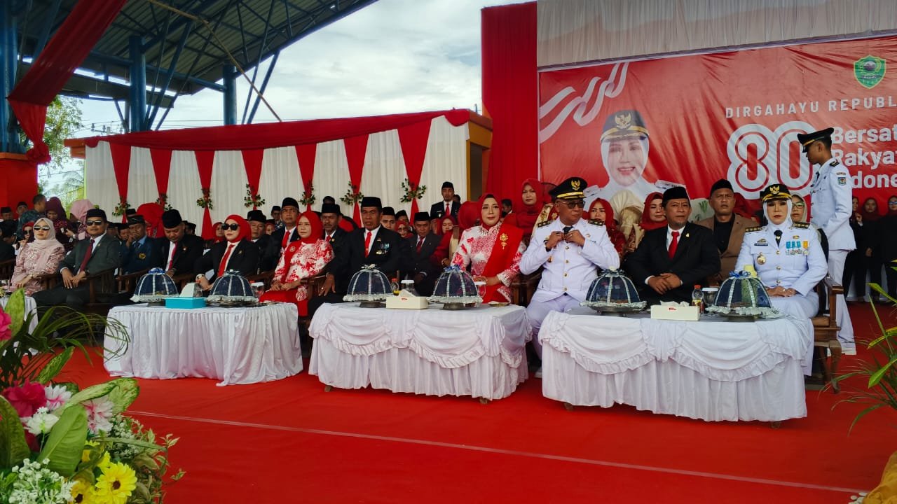 Pembacaan teks bersejarah tersebut menjadi momen puncak yang mengingatkan kembali akan perjuangan para pahlawan bangsa. Seluruh peserta upacara berdiri tegak penuh hormat, menyimak setiap kalimat Proklamasi yang menjadi tonggak lahirnya Indonesia merdeka.