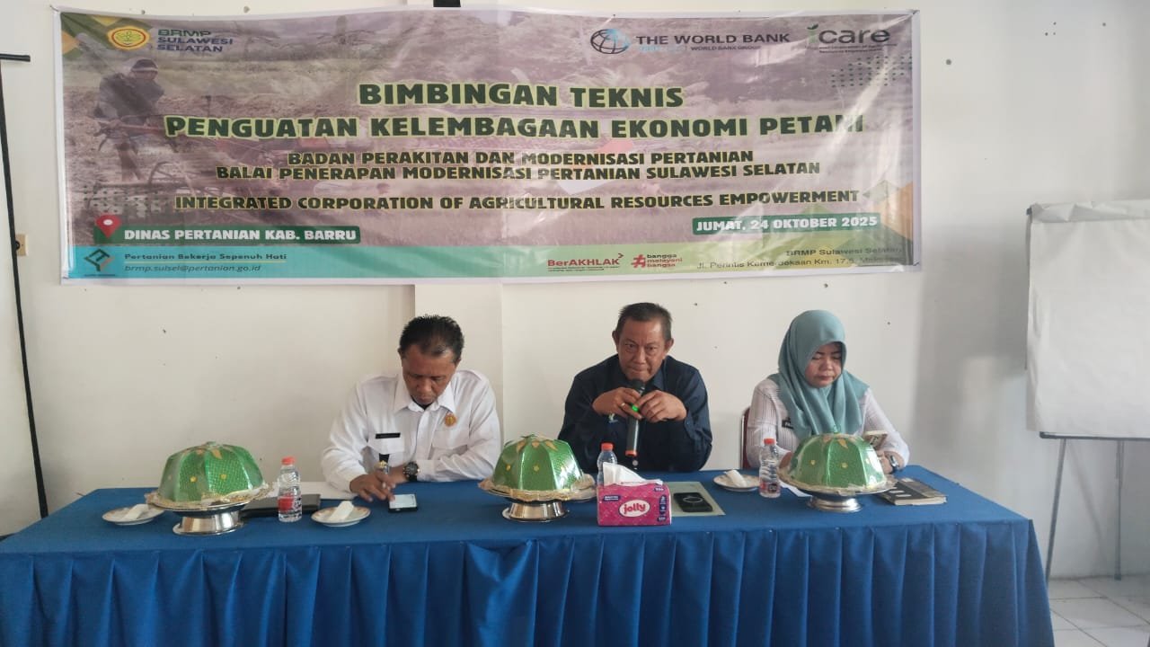 Satukatanews.com. – BARRU – Kepala Balai Penerapan Modernisasi Pertanian (BPMP) Sulawesi Selatan, Ir. Yusuf, M.Si., memberikan Bimbingan Teknis (Bimtek) Penguatan Kelembagaan Ekonomi Petani yang dilaksanakan di Aula Dinas Pertanian Kabupaten Barru, Jumat (24/10/2025).