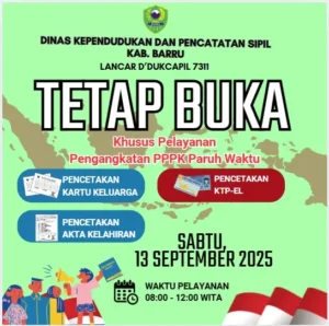 Satukatanews.com. – BARRU – Dinas Kependudukan dan Pencatatan Sipil (Disdukcapil) Kabupaten Barru menunjukkan komitmennya dalam memberikan pelayanan terbaik bagi masyarakat dengan tetap membuka layanan administrasi di hari libur pada Sabtu, 13 September 2025. Langkah ini diambil untuk mendukung kelancaran proses administrasi calon Pegawai Pemerintah dengan Perjanjian Kerja (PPPK) Paruh Waktu yang saat ini tengah melengkapi persyaratan administrasi dan kelengkapan lainnya.