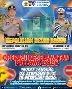 Satukatanews.com. – BARRU – Kepolisian Resor Barru resmi menggelar Operasi Keselamatan Pallawa 2026. Hal ini ditandai dengan Apel Gelar Pasukan yang dilaksanakan di Halaman Polres Barru, Senin (02/02/2026). Operasi yang mengedepankan Satuan Lalu Lintas ini akan berlangsung selama 14 hari, terhitung mulai tanggal 2 Februari hingga 15 Februari 2026.