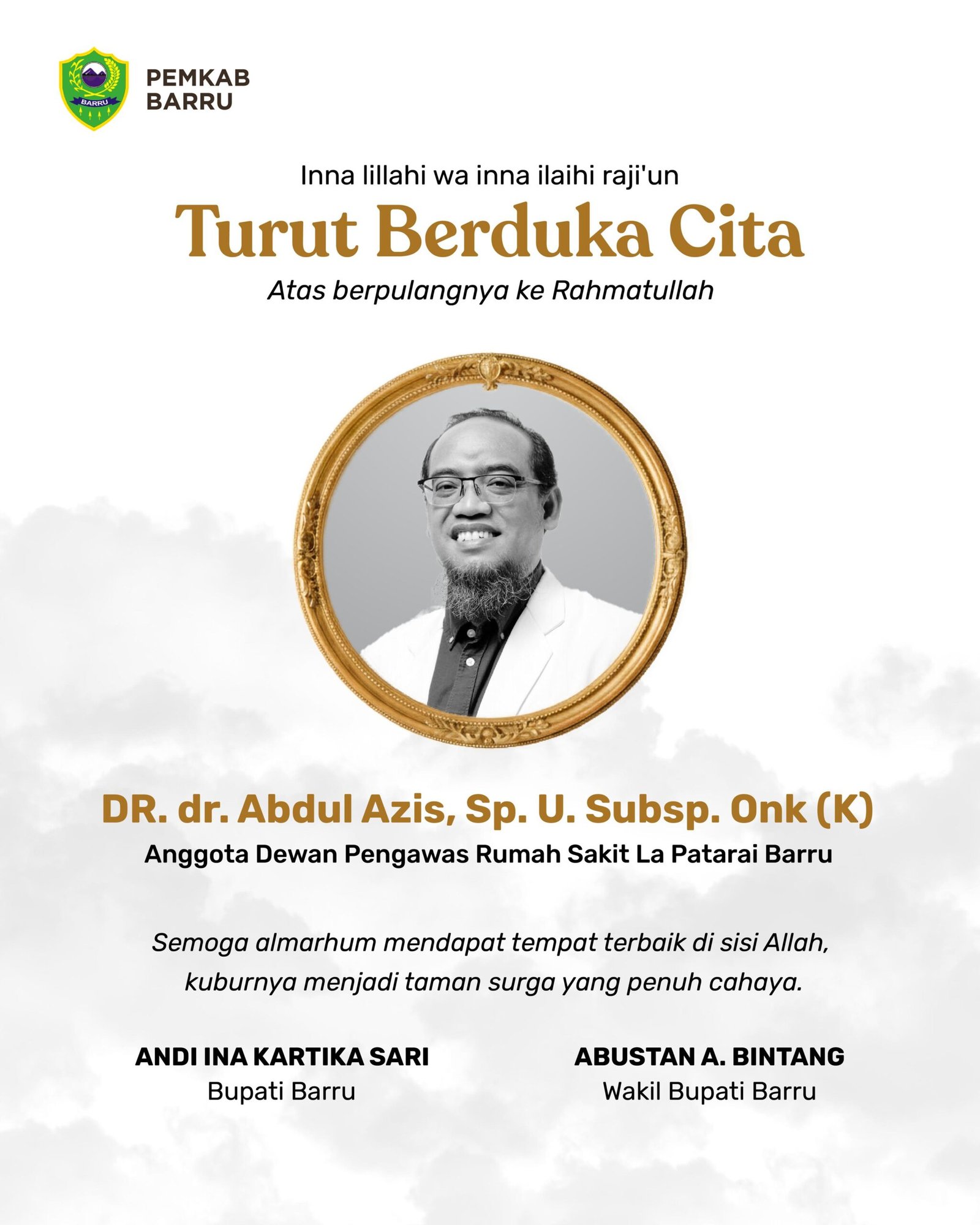 Satukatanews.com. – BARRU – Atas nama pribadi dan Pemerintah Kabupaten Barru, saya menyampaikan duka cita yang mendalam atas berpulangnya *DR. dr. Abdul Azis, Sp.U. Subsp. Onk (K), Anggota Dewan Pengawas RSUD La Patarai Barru sekaligus Ketua IDI Makassar*