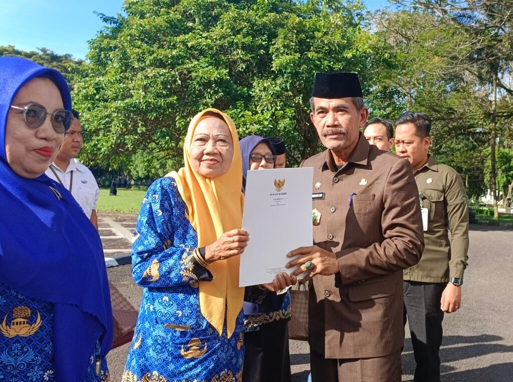 Setelah upacara dilanjutkan dengan penyerahan SK pensiun kepada 12 ;PNS yang yang telah memasuki batas usia pensiun.