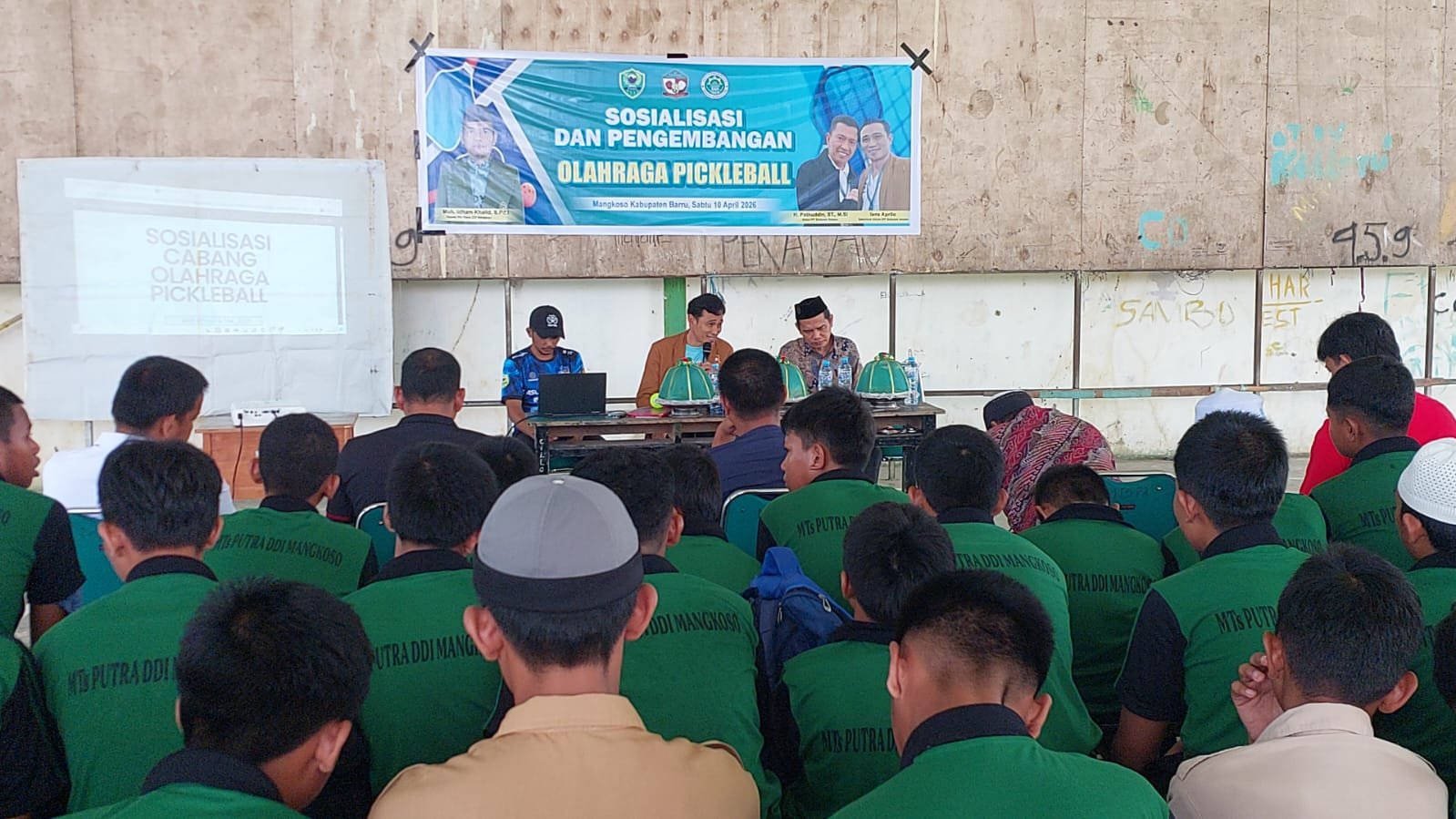Satukatanews.com. – BARRU – MTs DDI Putra Mangkoso Barru menggelar kegiatan sosialisasi dan pengembangan olahraga Pickleball sebagai upaya memperkenalkan cabang olahraga baru kepada para siswa, sekaligus mendorong gaya hidup sehat di lingkungan sekolah, dihadiri Ketua IPF Sulawesi-selatan, H. Fatahuddin, ST., M.SI., Sekretaris Umum IPF Sulawesi,swlatan, Ians Afrilo, Sabtu, 11/4/2026.